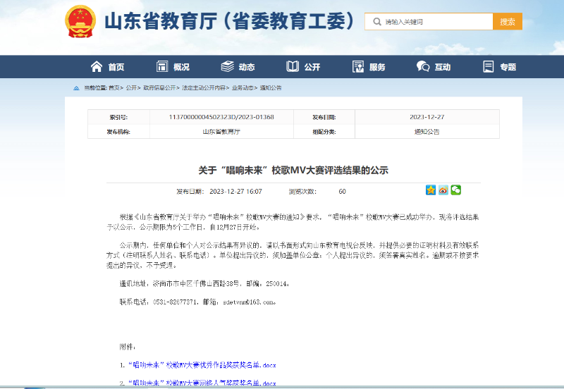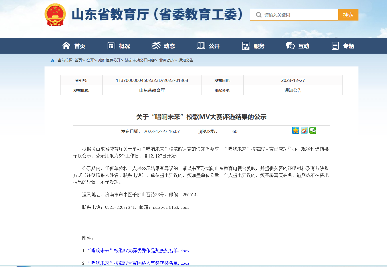 日前,山东省教育厅发布《关于“唱响未来”校歌MV大赛评选结果的公示》,济南市教育系统揽获三个类别51个奖项,获奖数量最多。